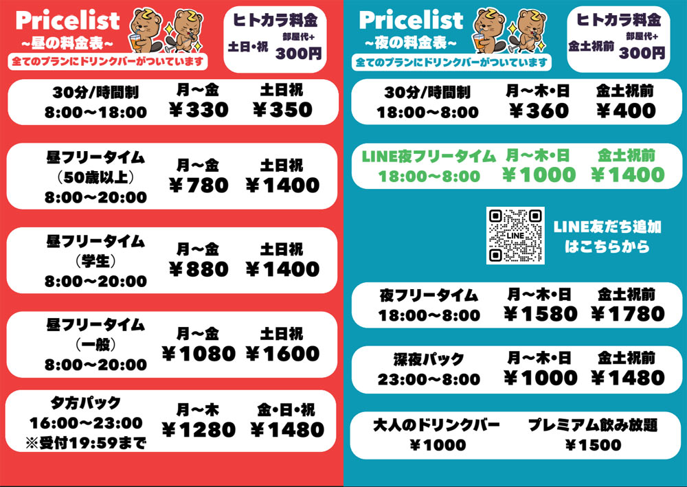 | 夜(金土祝前) | 部屋代+300円 |