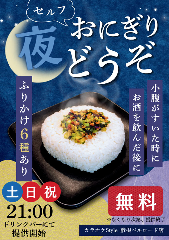 セルフ夜おにぎり 2026.04.24 セルフ夜おにぎり 土日祝 21:00~ ドリンクバーにて提供開始! 無料です 小腹が空いたときや、 お酒を飲んだ後などにどうぞ。 ※なくなり次第提供は終了します。 Tweet Share Hatena Pocket RSS feedly Pin it 200ポイント保持で室料10%OFF 前の記事 クッキー食べられます! 次の記事