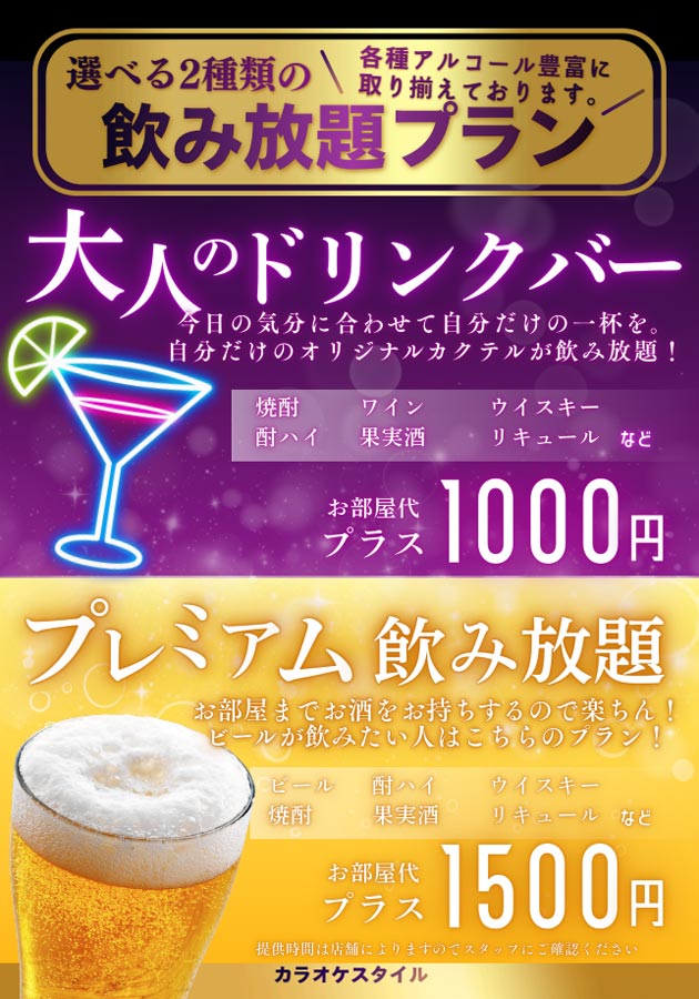ビール3種・ハイボール3種・果実酒3種・カクテル16種・ノンアルコールビール・焼酎&日本3種・酎ハイ8種 ・ソフトドリンクあり