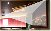100インチの大型プロジェクター画面を設置しています。 カラオケ映像はもちろん、お客様がお持込みいただいたDVDの映像を大迫力でお楽しみいただけます。